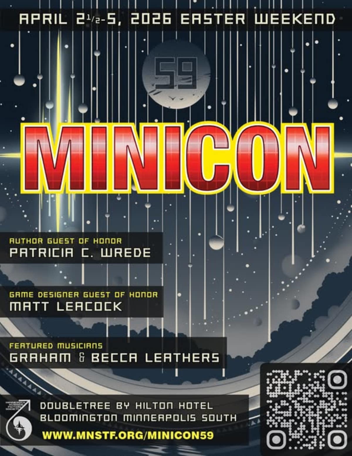 Come to Minicon 59! SFF con in Bloomington, MN. I'll be there Apr 2-5, 2026. Author table, panels, and a reading. Schedule coming soon.